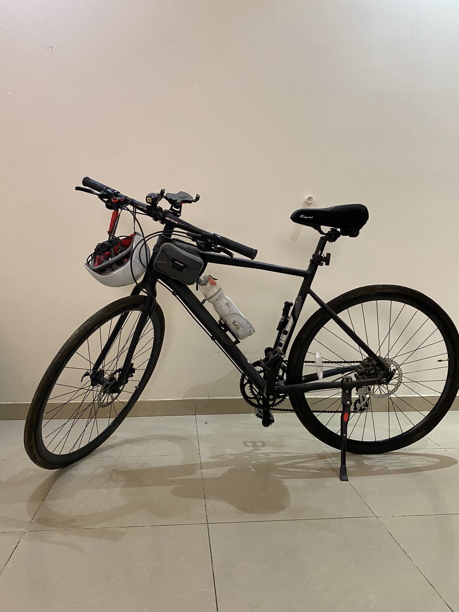 خوذة، قفازات، حقيبة، أنوار ليد أمامية وخلفية USB، قارورة ماء، منفاخ صغير، حامل (جلاس)،