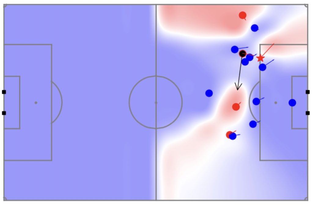 يتم عمل freez frame ( لقطة ثابتة لحظة الحدث) ويقوم بعد ذلك تقييم جميع التحركات.. قيمة المساحة المفتوحة تحددها قيمة أفضل تمرير ممكنه اثناء تلك اللحظة
