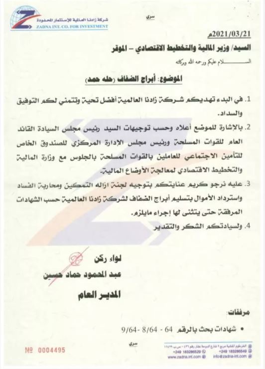وقالت مصادر مطلعة إن (اللواء/ عبد المحمود حماد) مدير (شركة زادنا) خاطب وزير المالية، جبريل إبراهيم، بتاريخ (21/03/2021)، وأمره بتوجيه (إزالة التمكين) للعدول عن قرارها تنفيذاً لتوجبهات رئيس مجلس السيادة الانتقالي، عبدالفتاح البرهان، بإعادة الأرض والبرجين لشركة (زادنا).