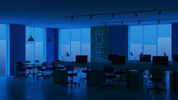 في تلك اللحظة التي تطفأ فيها الاضواء، وتحل العتمة على جنبات المكان، وتلمح في الظلام شاشات الاجهزة، واثاث المكاتب ومحتوياته هامدة بلا حركة .!