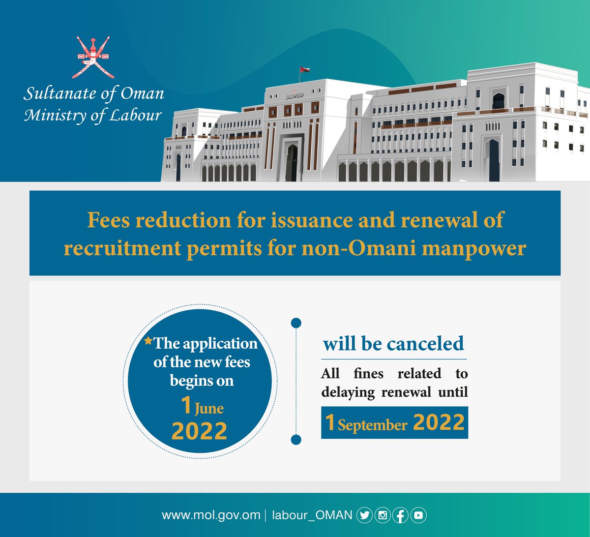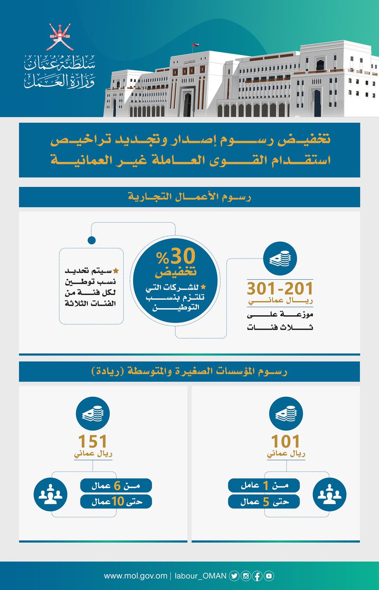 تنفيذاً للتوجيهات السامية بشأن تخفيض رسوم الخدمات الحكومية #وزارة_العمل تعلن عن تخفيض رسوم تراخيص استقدام القوى العاملة غير العمانية وفقاً لنوعية المهن التي يمكن إحلالها بالقوى العاملة الوطنية وتتناسب مع الباحثين عن عمل بجميع المستويات التعليمية.