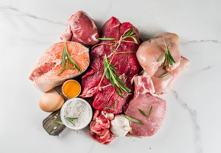 لحم ، أحمر ، سمك سالمون ، بيض ، كبدة،