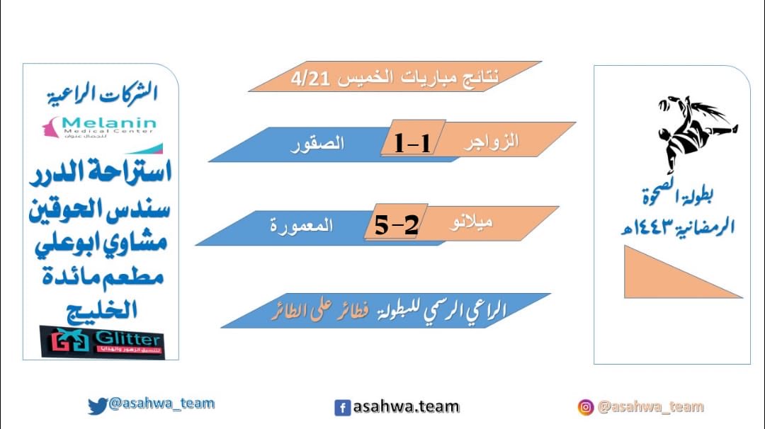 نتائج مباريات يوم #الخميس الموافق 21/4/2022 من #بطولة_الصحوة_الرمضانية_1443 التي ينظمها #فريق_الصحوة