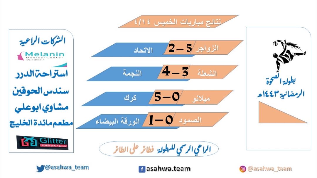 نتائج مباريات يوم #الخميس الموافق 7/4/2022 من #بطولة_الصحوة_الرمضانية_1443 التي ينظمها #فريق_الصحوة