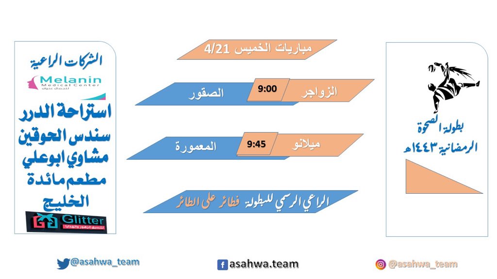 مباريات يوم #الخميس الموافق 21/4/2022 من #بطولة_الصحوة_الرمضانية_1443 التي ينظمها #فريق_الصحوة