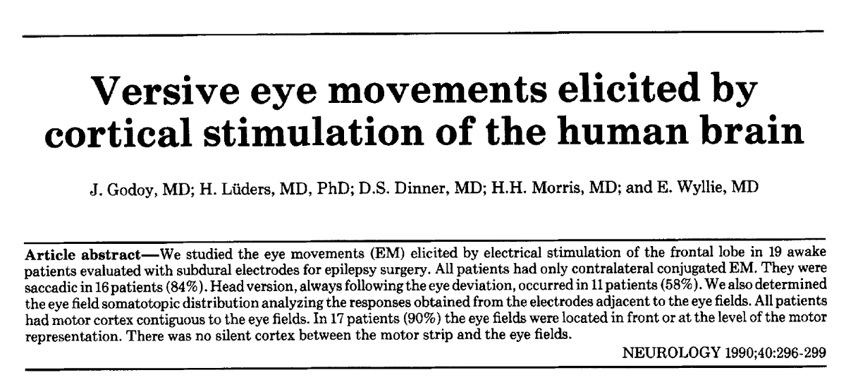12/ Summary- Versive head and eye movements are forced, sustained, unnatural (as if looking back and over the shoulder). These lateralize to contralateral hemisphere with a very high reliability. The most likely symptomatogenic zone is FEF. #Epilepsy #Seizure #NeuroTwitter