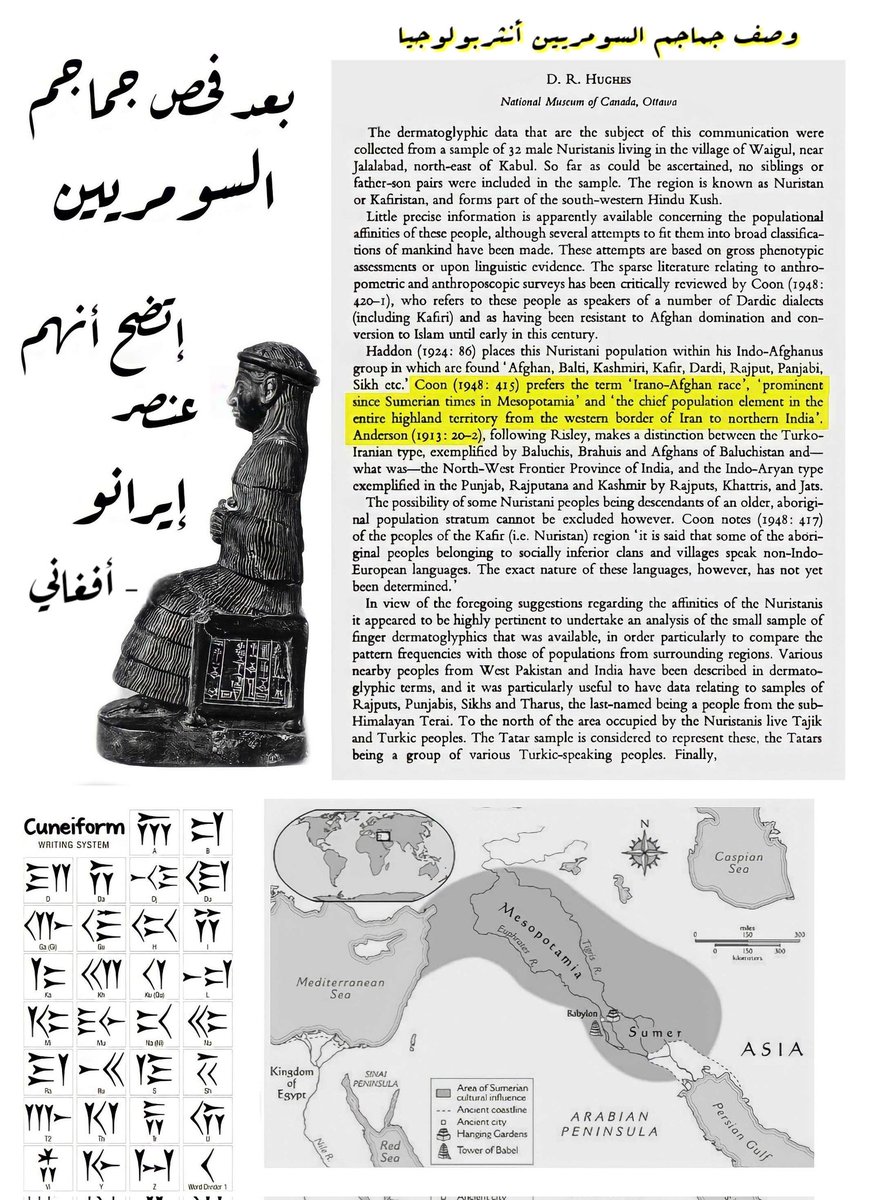 ☆ المصدر بالأسفل، وهو بحث للأنثربولوجي دونالد هيو (من أوائل من قارن شعوب إيران وافغانستان بالسومري القديم) :