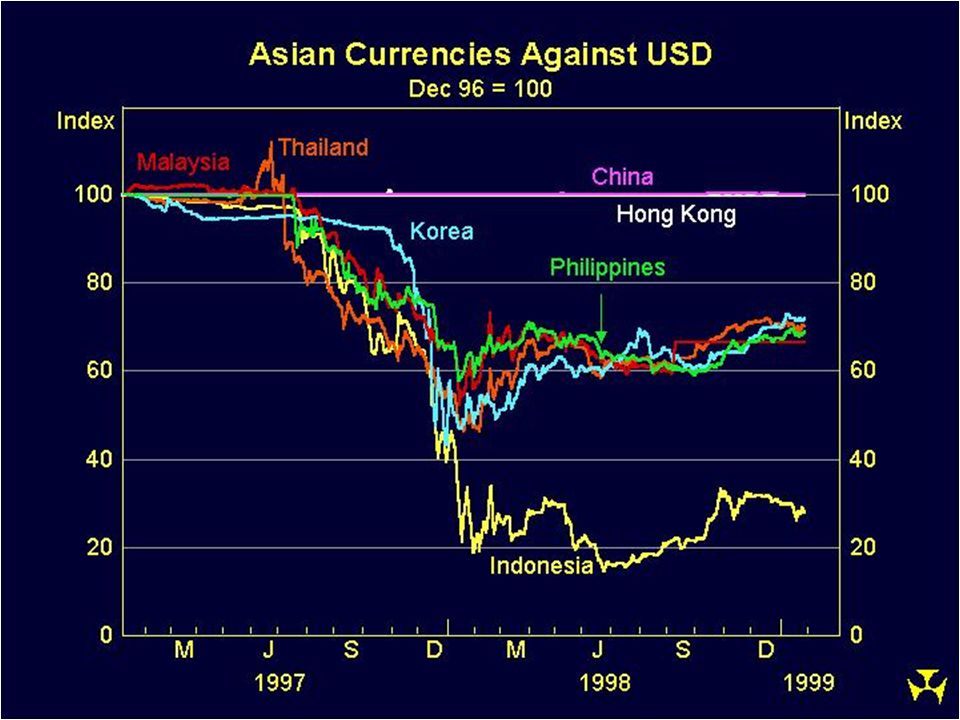 وايضاً في اواسط التسعينات غيرت سلسلة من الصدمات الخارجية الوضع الاقتصادي حيث ان الصين خفضت من قيمة اليوان بشكل مفاجئ وخفضت اليابان قيمة الين والفدرالي الامريكي تحت قيادة جرينسبان اصبح يزيد نسبة الفائدة تدريجياً