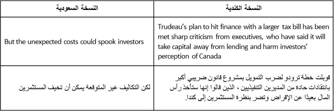2. ففي المقالة الكندية، تحدثت الصحيفة عن نية الحكومة الكندية فرض ضرائب إضافية على القطاع البنكي وفي المقالة السعودية عن نية الحكومة السعودية فرض ضرائب على شركات التقنية. سنورد النص الإنجليزي ونترجمه وسنذكر في التعليق مدى التحيز.