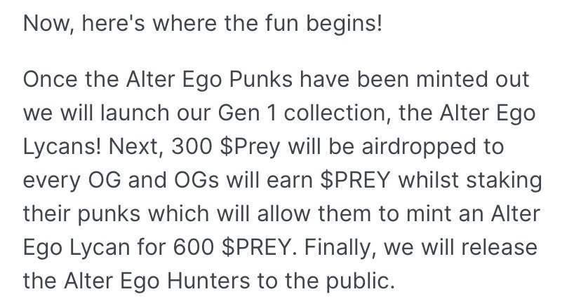 Alter Ego Lycans is a collection of 4,000 NFTs that can be obtained by breeding with 600 $PREY & 2 Alter Ego Punks. There will be 4-6 tiers available with different color combinations. Our Genesis 1 & 2 collections will be 2D/3D NFTs with animated features & sound effects.