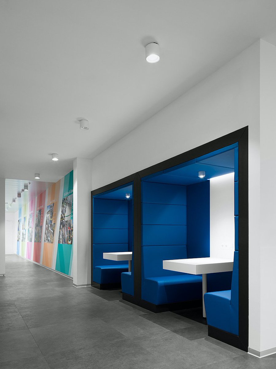 فالمكاتب الخاصة تنفرد بتصميم عن الاماكن المشتركة و البوفيه ينفصل عن الادارة والانتظار عن الممرات