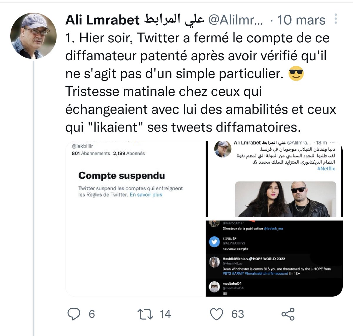 20/2. نهار 10 مارس 2022، علي لمرابط @Alilmrabet غيكون أول واحد كيعلن توقيف حساب زميلي وصديقي العزيز عماد لكبير الشهير ب "#دبيبينة #Dbibina" لي كان مرونها فتويتر ومطير النعاس من الرباعة ديال العدميين وأشباه المناضلين والمعارضين والصوحافيين، بسبب ما كان ينشره من حقائق مزعجة عنهم..