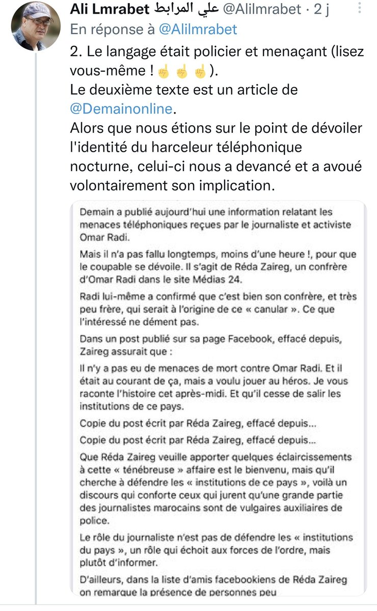 20/12. الحقيقة أن لمرابط @Alilmrabet طلع أصلا خفيف و"فريفيرة" وفضح راسو براسو... ماشي حيت كان أول واحد عاوتاني كيخرج يأكد بلي دبيبينة هو رضا زيرق (كيف كان هو الأول لي علن بلي الحساب ديال عماد لكبير فتويتر تسد).