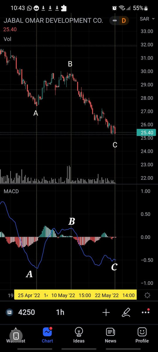 بما أن الفوليوم والماكد في الموجةC اقل من الموجةA في جميع الموجات الداخليه 1 و 3 و 5 ؛ هنا يبدا ظهور دايفر ظاهر (اما سلبي او ايجابي) ليعكس اتجاه المسار ما بعد الموجة الخامسة من الموجةC