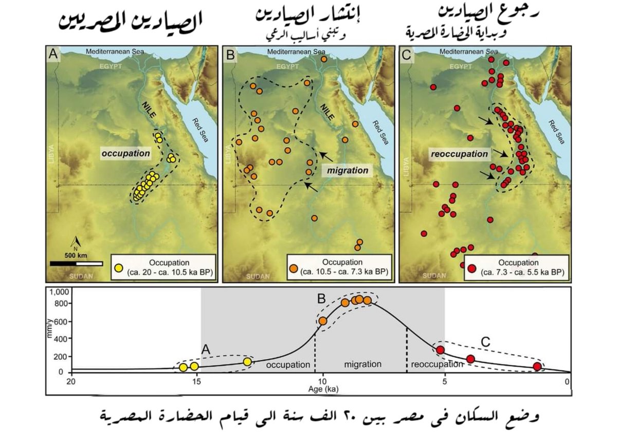 فبداية تكون الأمة المصرية في السجل الأركيولوجي يرتبط إرتباط وثيق بعصر الصحراء الخضراء حين سكن كامل الركن الشمالي الشرقي من إفريقيا نوع من الرعاة ذوي اصل لصيادي وادي النيل الذين تأقلموا مع العصر المطير ثم إرتدوا مع انحسار سقوط الأمطار علي المنطقة،