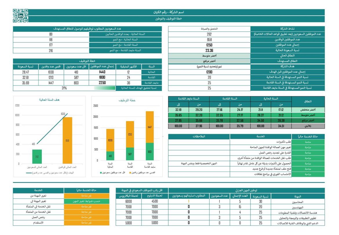 ملف اكسل Excel يوضح وضع الشركة في #نطاقات وسعودة المهن ويضع خطة توظيف بناء على هدف الشركة من نمو او استقرار.