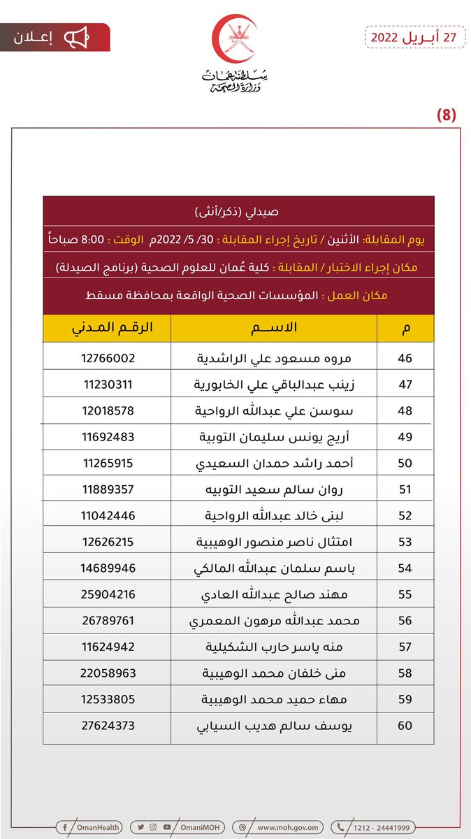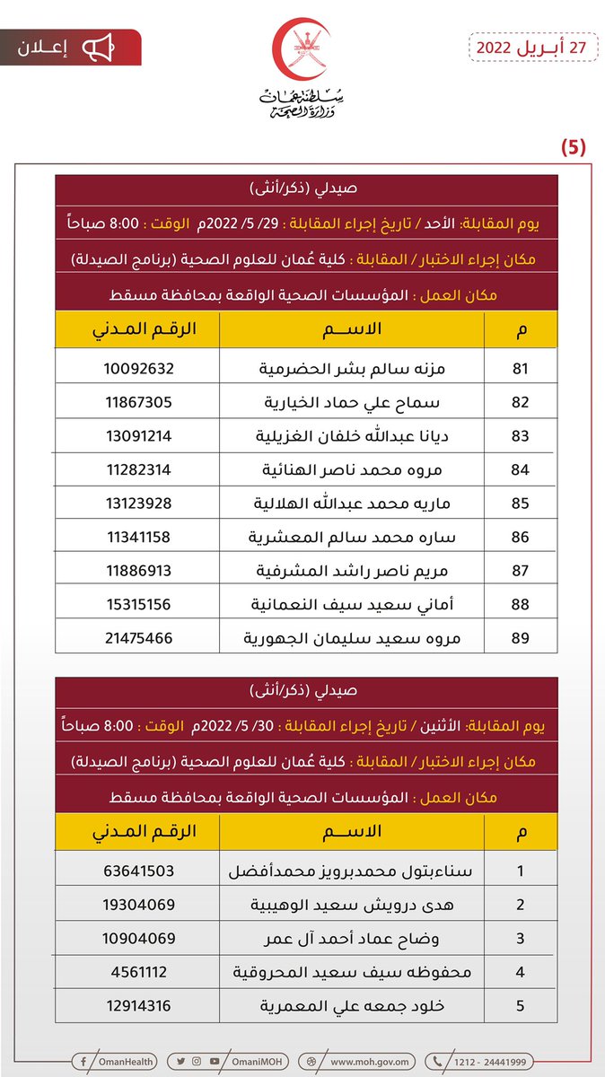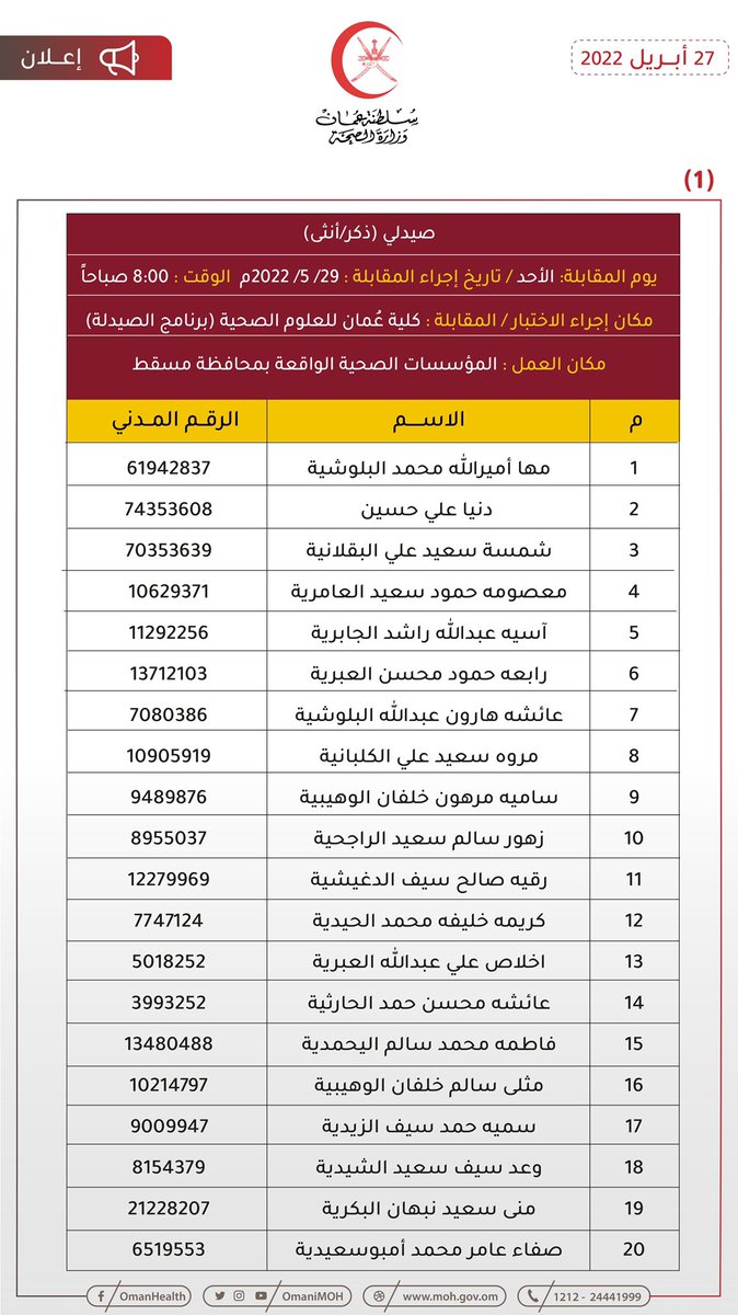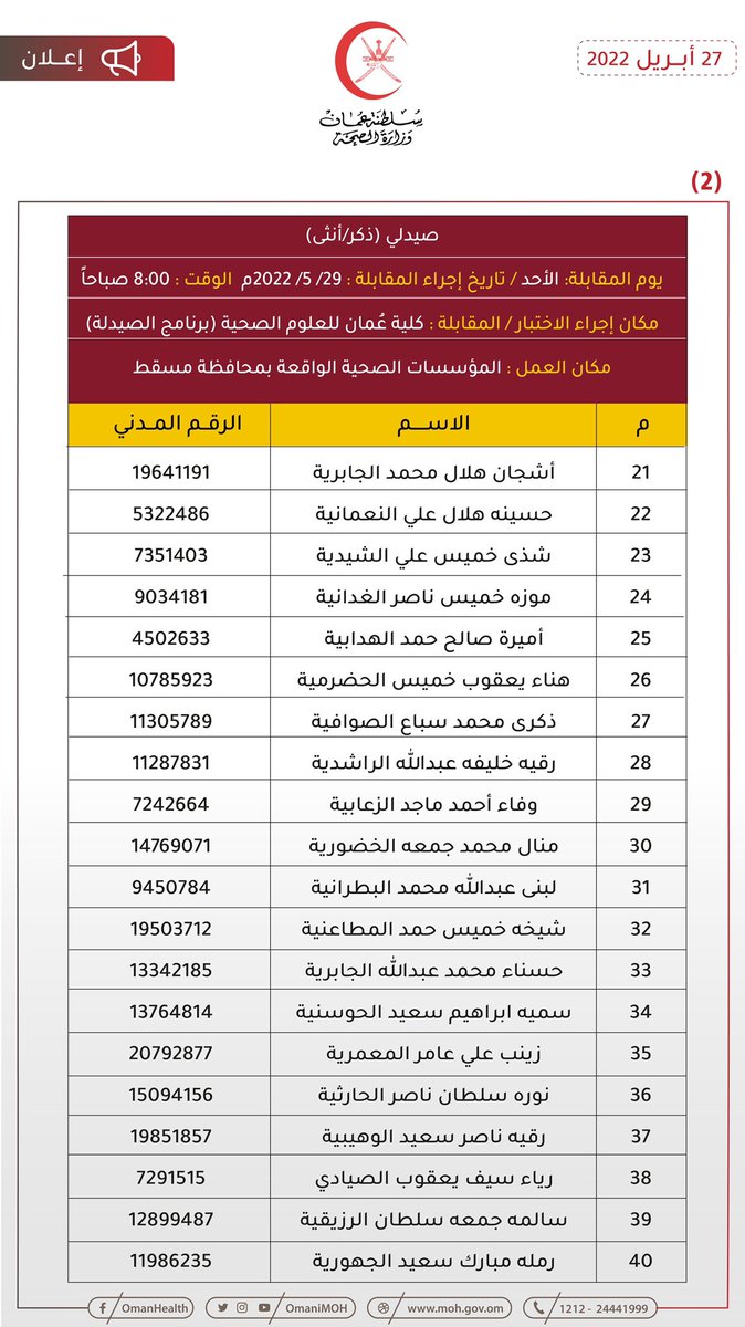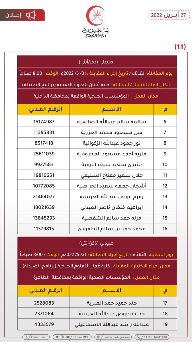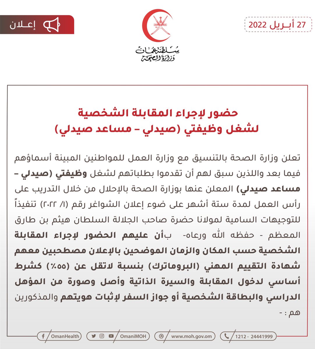 🔴 تعلن وزارة الصحة بالتنسيق مع وزارة العمل للمواطنين المبينة أسماؤهم فيما بعد والذي سبق لهم أن تقدموا بطلباتهم لشغل وظيفتي (صيدلي – مساعد صيدلي) المعلن عنها بوزارة الصحة بأن عليهم الحضور لإجراء المقابلة الشخصية حسب المكان والزمان الموضحين بالإعلان