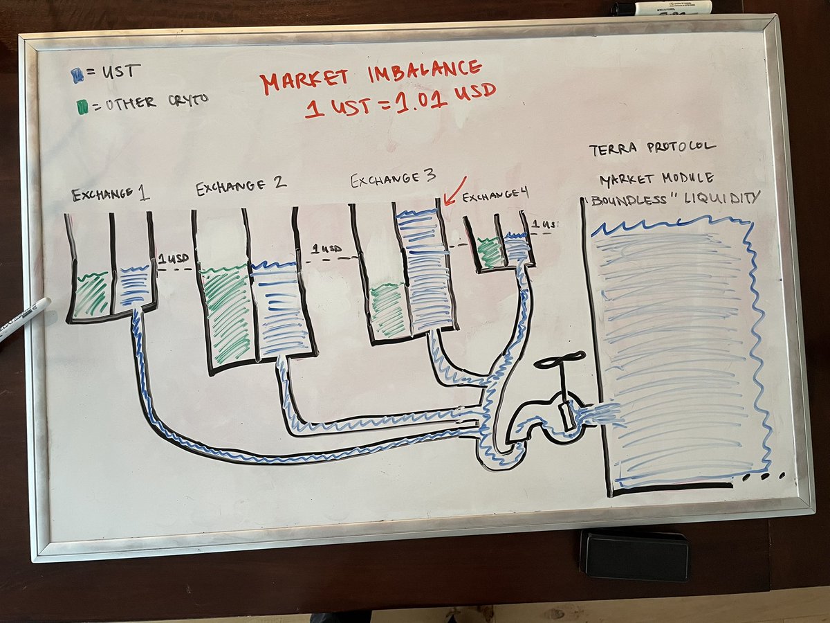 6/7 I’ll talk about how the spread works and why we have one another time. Just know that it prevents Oracle attacks and combats volatility spikes. TLDR: market module mint/burn process modulates supply of UST and balances prices of external exchanges through arbitrage.