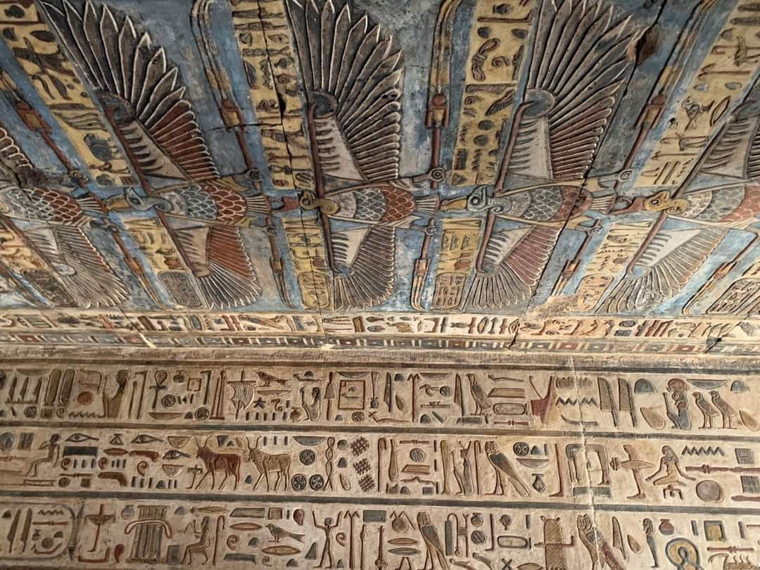 أحمد إمام مدير فريق الترميم أن أثناء تنظيف إفريز الجدار الغربي في محور المعبد عثر فريق الترميم على نقشًا يونانيًا مرسومًا بالحبر الأحمر كان مغطى تمامًا تحت السناج الأسود والدراسات الأولية لهذا النص ترجح أنه يرجع لفترة الإمبراطور دوميتيان(81-96م) 👇5