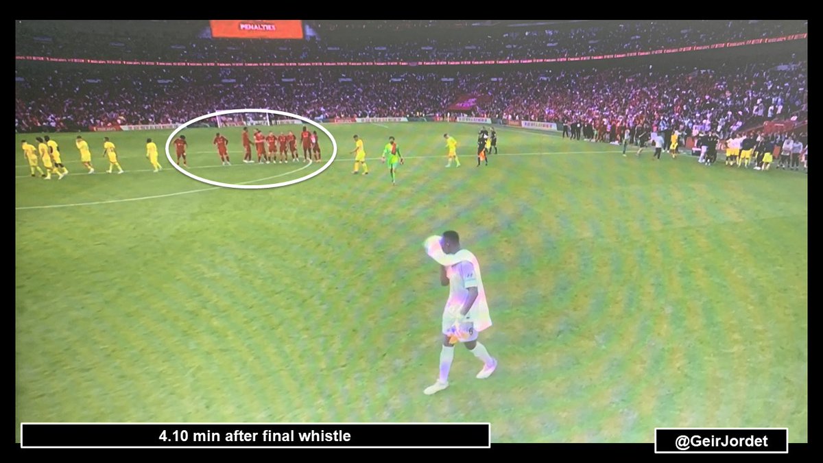 Because Liverpool finished their huddle early, they step into the mid circle first, and get to pick position. They pick the side closest to their bench, which enables staff to give further instructions during the shootout & maintains closeness to the warmth of the manager. 8/9