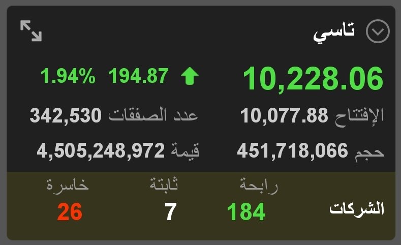 حقق #تاسي الأدنى عند مستويات 9955 تقريبا واليوم يتحرك صعودآ بارتفاع 194 نقطة حتى الان وبسيولة بلغت 4.5