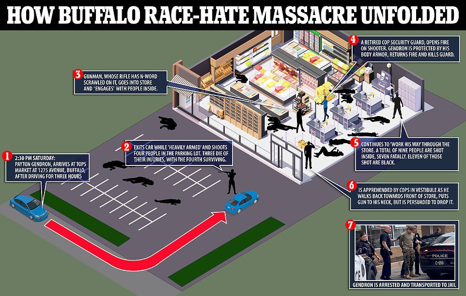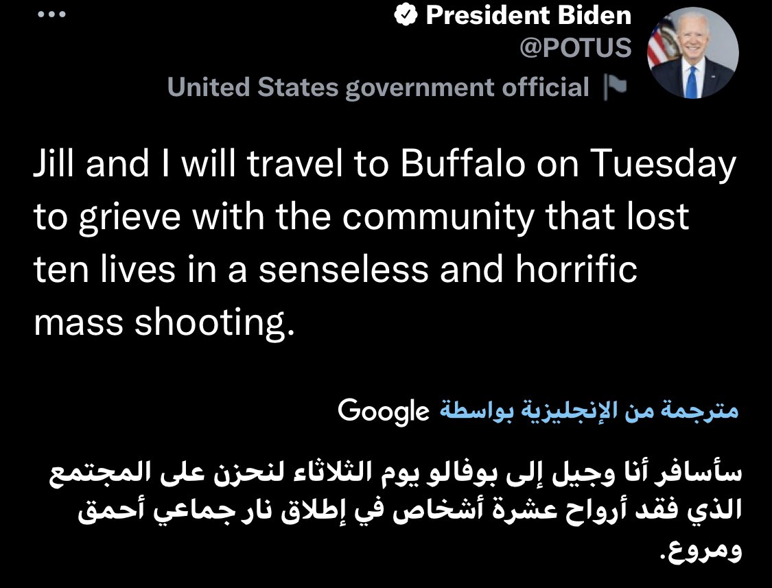 وقعت حادثة قتل جماعي في مدينة بوفالو بولاية نيويورك جعل بايدن وزوجته يسافران لها لتقديم العزاء على أسرة الضحايا وقال عنها:إطلاق نار جماعي لا معنى له ومروع