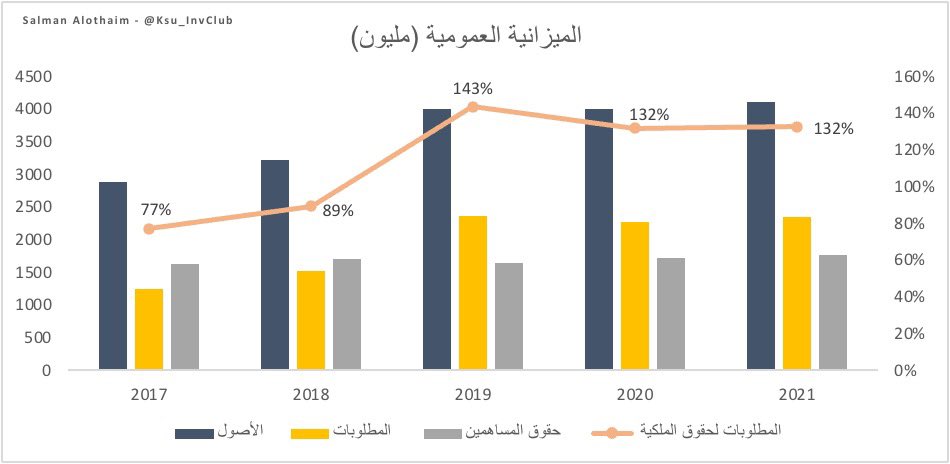 اما بالنسبة للأصول ففي عام 2017 كانت قرابة 2.9 مليار وأصبحت 4.11 مليار في 2021. وأيضاً المطلوبات ارتفعت خلال هذه الفترة، فبعد ان كانت المطلوبات لحقوق الملكية 0.77 في 2017 أصبح 1.32 في 2021.