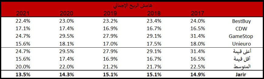وبعد المقارنة فإن #جرير مقارنة بالشركات العالمية المختارة وكما هو الحال على الصعيد المحلي هي الأقل من حيث هامش الربح الإجمالي الا انها الأعلى من حيث هامش الربح التشغيلي وهامش صافي الربح.