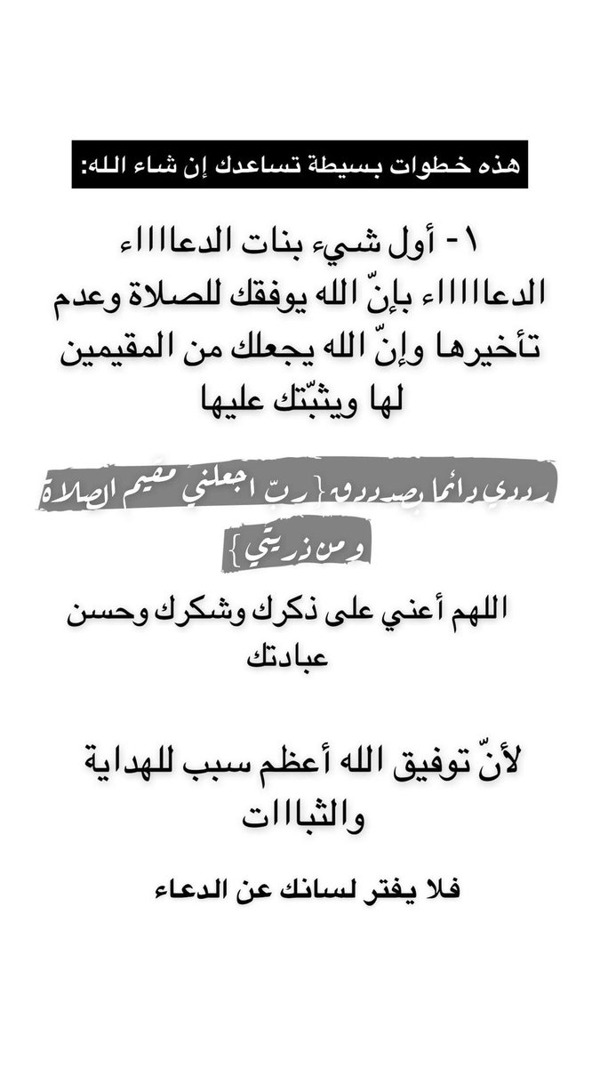 الصلاة هي السعادة والنور والراحة والطمأنينة ، مهما لفّيتي ورجعتي مستحيل تلقين سعة الصدر وانشراح البال والراحة النفسية إلا في الصلاة فمن اليوم : لا للتهاون❌ ، لا للتأخير❌ ، لا للاستعجال ❌