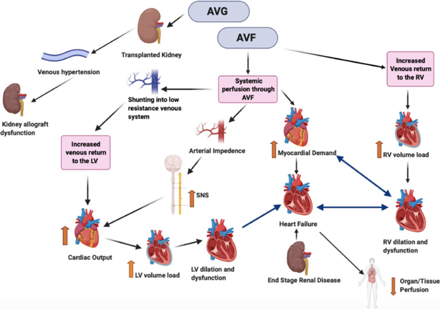 26) In addition, through its effect as a left-to-right extracardiac shunt, the arteriovenous fistula can increase cardiac workload substantially, & in some pts ➡️high-output state & resultant HF over time.