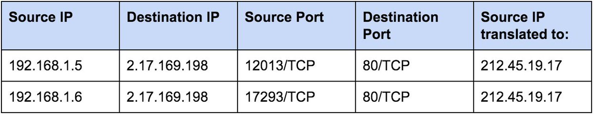 ففي الشبكة الواحدة كل جهاز له عنوان خاص لكن كلها تشترك في عنوان عام واحد.فمثلا لو طلب جهاز A وجهاز B بيانات من النت فسيتم ارسال الطلب باستخدام عنوان الراوتر لكلا الجهازين ويتم حفظ بيانات الجهازين في جدول خاص في الراوتر.