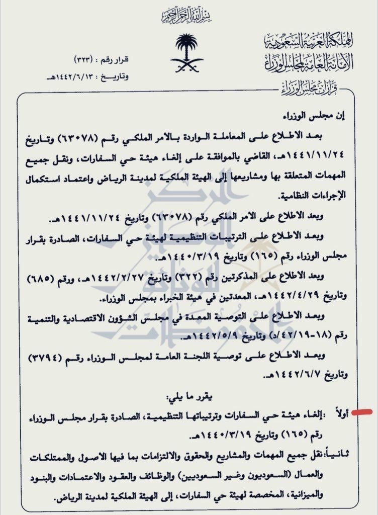 1/ يتساءل البعض عن سبب صدور "الترتيبات التنظيمية" للجهاز الحكومي أو "التنظيم" للجهاز الحكومي بموجب قرار من مجلس الوزراء وليس بأمر ملكي أو بمرسوم ملكي كونها أدوات أسمى قانونياً، وعلّة ذلك نظام مجلس الوزراء ذاته الذي منح للمجلس هذا الاختصاص، وهو اختصاص "إحداث وترتيب المصالح العامة"