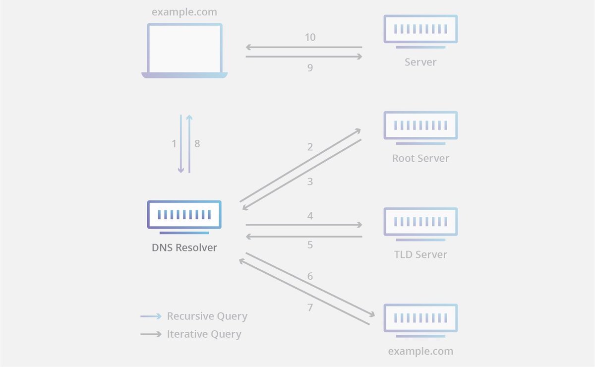 تتضمن عملية حل DNS تحويل اسم المضيف (مثل example.com) إلى عنوان IP صديق للكمبيوتر (مثل 192.168.1.1)