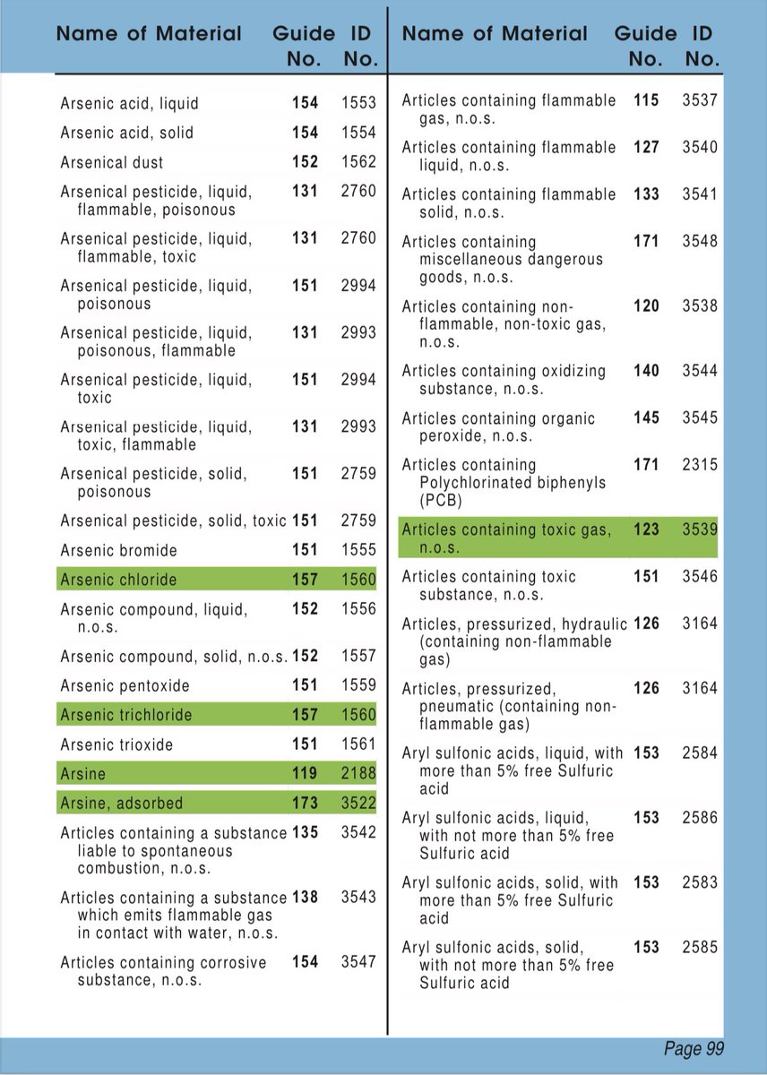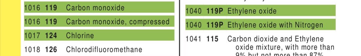 - بجانب الاسم الكيميائي يوجد رقم ERG المكون من 3 أرقام ورقم الأمم المتحدة المكون من 4 أرقام للمادة الكيميائية.