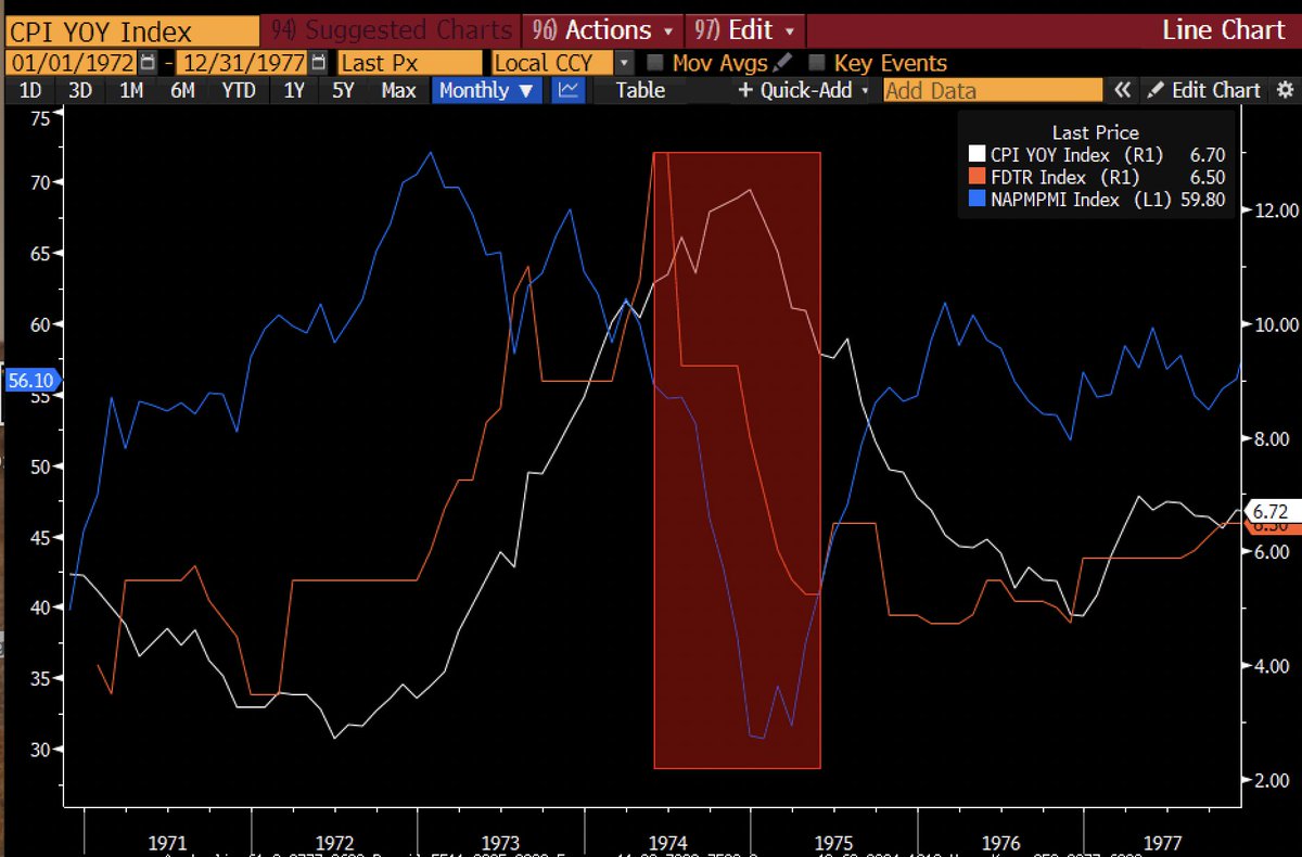 In fact, going back to 1970, every time the ISM hit 50 the Fed paused or cut. Thus the ISM is THE key variable. In nearly all examples, CPI was still elevated or hadn't even peaked...
