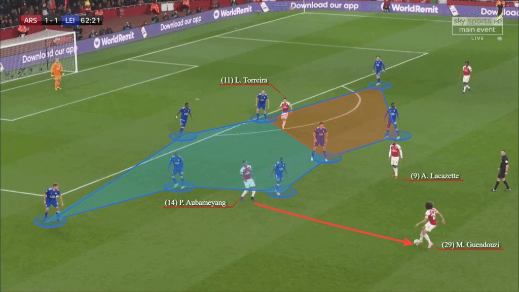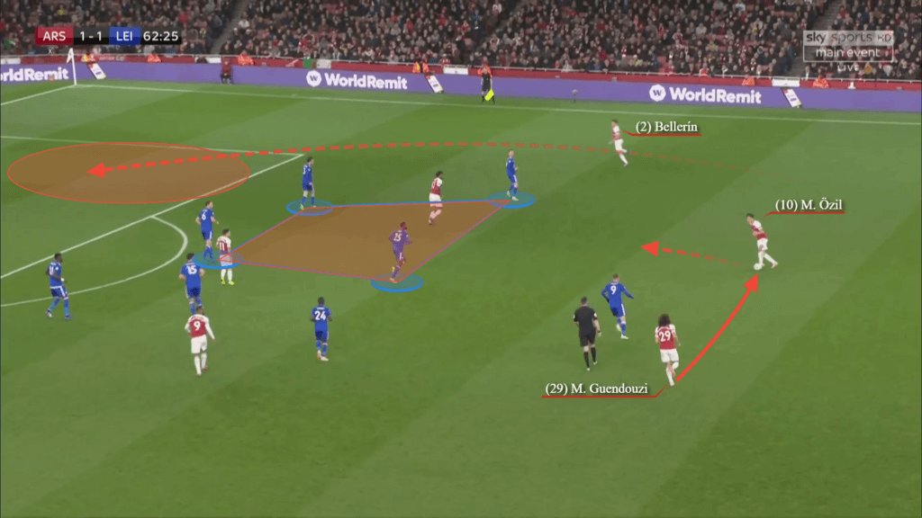 بعد مرور 31 دقيقة من عمر المباراة، تقدم ليستر بالنتيجة. وسواء كان ذلك بتعليماتٍ من إيمري أو بـ بديهة أوزيل، بدأ أوزيل يميل أكثر نحو نصف المساحة الأيمن.