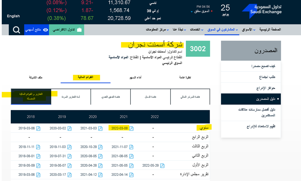 2/ نروح خانة البحث ونحط رمز الشركة ومن ثم نروح إلى الصفحة الخاصة بالشركة مثل شركة أسمنت نجران :
