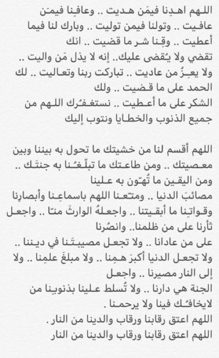 حديثَ الحسن بن عليٍّ -رضي الله عنه وعن أبيه- قال: علَّمني رسولُ الله ﷺ كلمات أقولهنَّ في الوتر : اللهم اهدني فيمن هديت، وعافني فيمن عافيت، وتولَّني فيمن تولَّيت، وبارك لي فيما أعطيتَ، وقني شرَّ ما قضيتَ، إنَّك تقضي ولا يُقضى عليك، إنَّه لا يذلّ مَن واليتَ، تباركتَ ربنا وتعاليتَ.