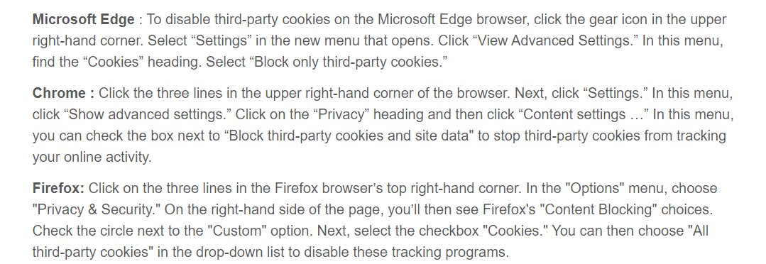 ولكن هذا لا يعني عدم التعدّي على خصوصيّتك أحيانًا، وذلك - مثلًا - من خلال نوع من ملفات تعريف الارتباط يدعى: ملفات تعريف الارتباط للطرف الثالث (third-party cookies)، الذي يسمح لمواقع أخرى بالتطفّل على ملف تعريف الارتباط الخاص بك..