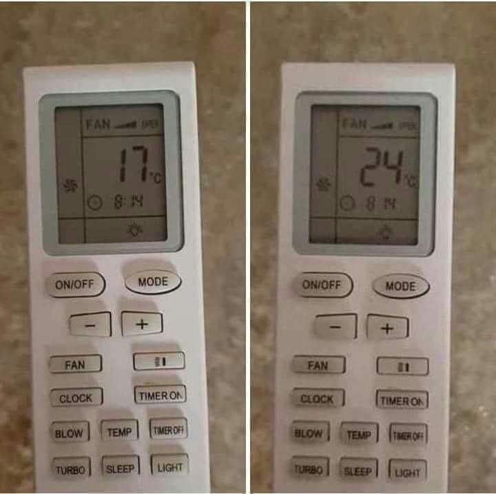 او 18 ، ودرجة الحرارة في الخارج تقترب من أو تفوق 40 درجة فإن ضبطك للجهاز يعتبر خاطئ وغير منطقي حيث لن يستطيع الجهاز الوصول بالغرفة إلى 17 أو 18 درجة مئوية وسيبقى محرك المكيف في حالة تشغيل دائم ولساعات طوال وسيؤثر ذلك على كفائته وعمره ناهيك عن الإستهلاك الزائد للطاقة.