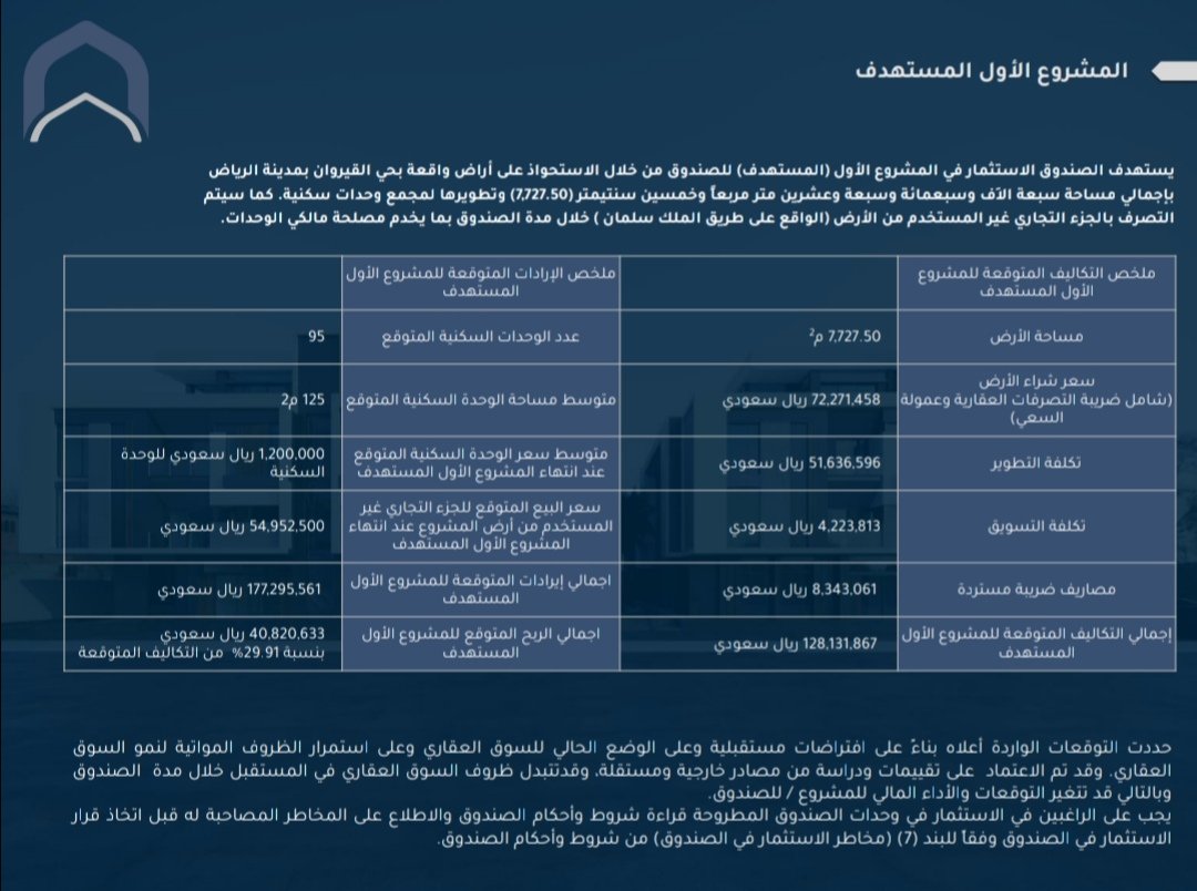 يهدف الصندوق للإستحواذ على أرض في حي القيروان في الرياض لإنشاء ٩٥ وحدة سكنية + سيتم بيع الجزء التجاري من الأرض و المطل على طريق الملك سلمان