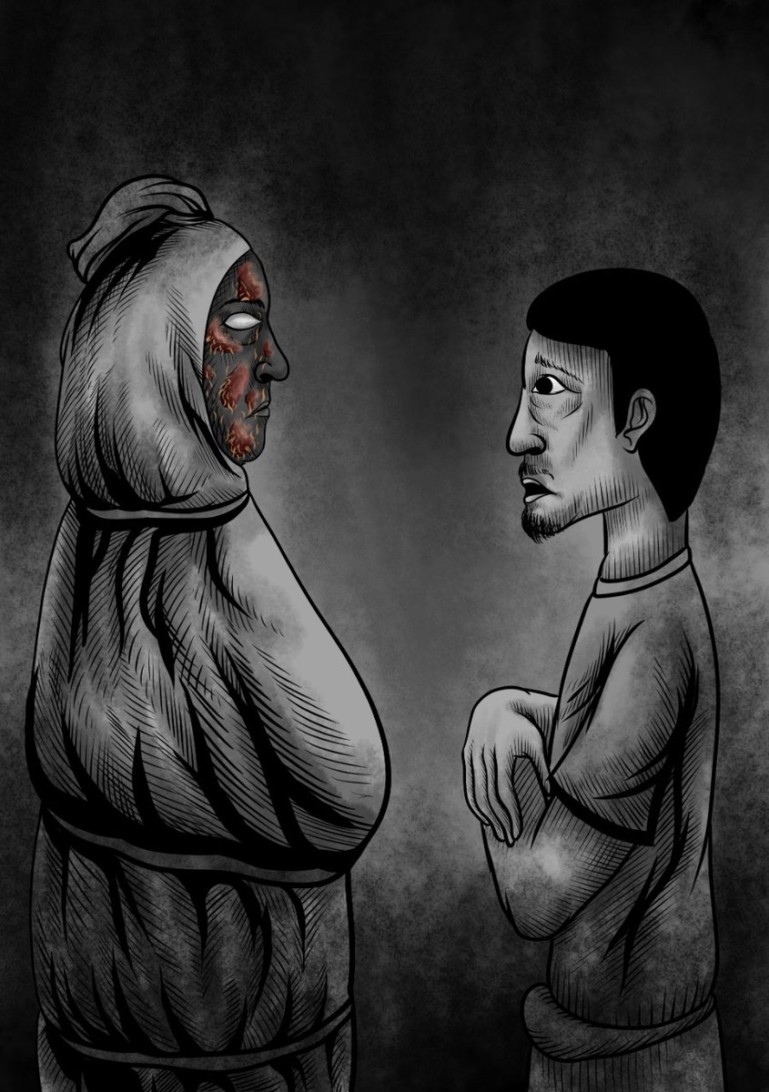 Sarno terkesiap, ketakutannya menjelma nyata, dunianya runtuh seketika mengetahui petaka yg dihindari satu desa ini selama bertahun-tahun telah tiba. Langkahnya spontan mundur menjauh dari jendela. Sorot matanya mengisyaratkan satu kalimat—