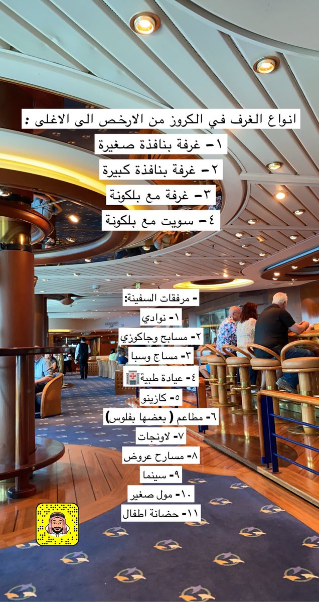 الكروز : نظامه يمر ع اكثر من مدينة وغالباً يوقف في كل مدينة من ١٠-١٢ ساعه وفي الوقت هذا تقدر تنزل تتمشى في المدينة وتستكشف وبعدها ترجع تركب السفينة وتبحرون للمدينة الي بعدها.. وطبعاً السفينة ماتوقف من كثر الفعاليات الي يسوونها من 8 am الى الساعة ١ Am