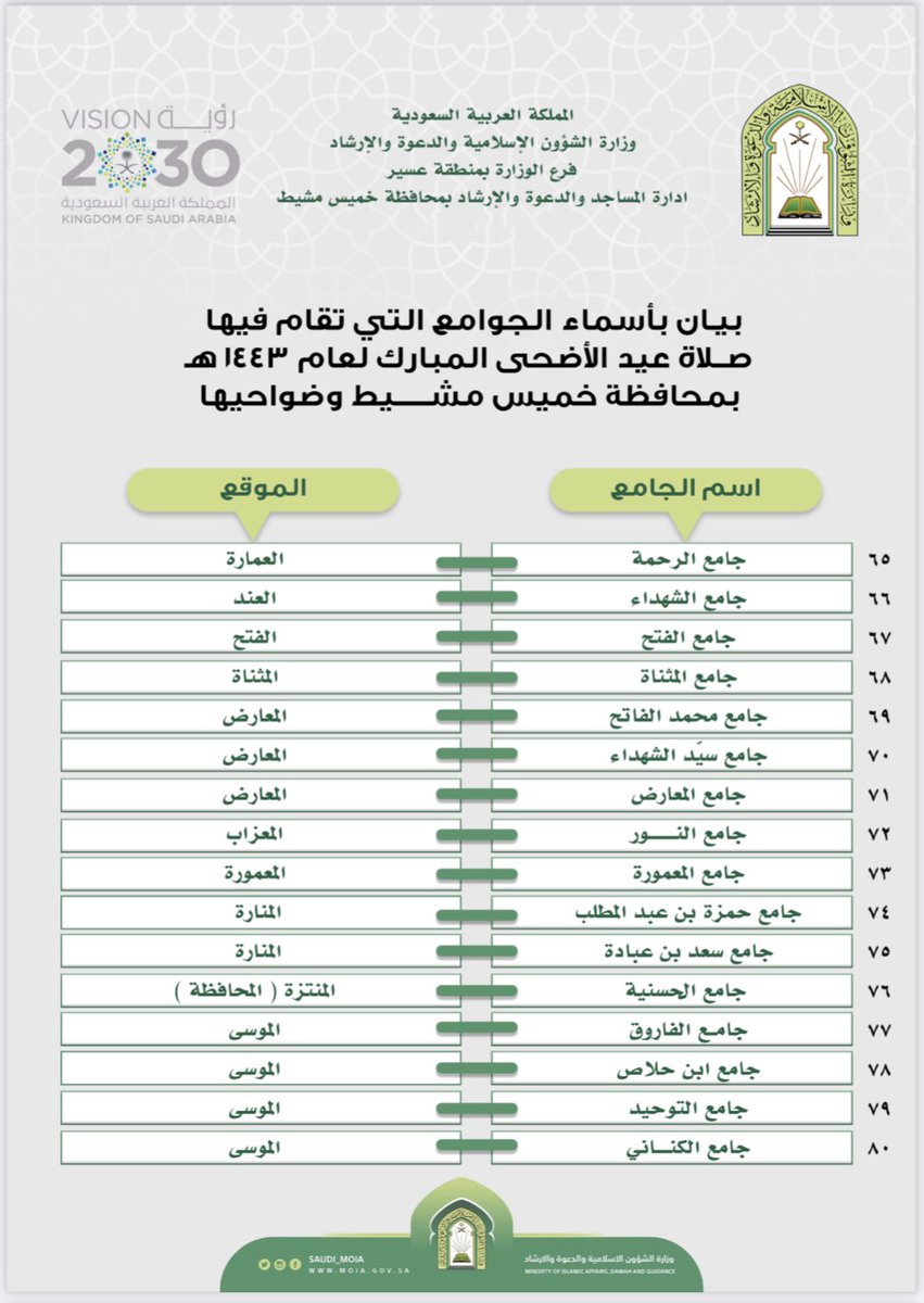 بيان بالمصليات والجوامع التي تقام فيها صلاة عيد الأضحى المبارك لعام ١٤٤٣هـ بمحافظة #خميس_مشيط والمراكز التابعة.