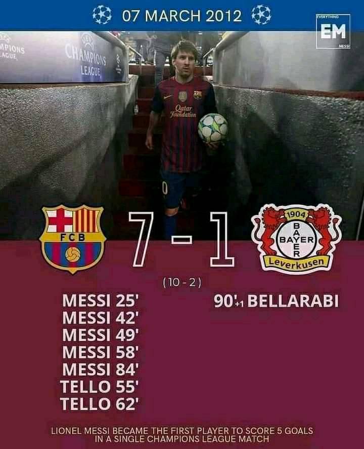من الأرقام المرعبة ف مسيرة ميسي إنه اللاعب الوحيد فالتاريخ إللي سجل ميجا هاتريك ف دور إقصائي ف دوري الأبطال