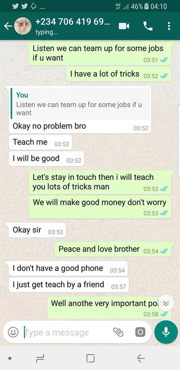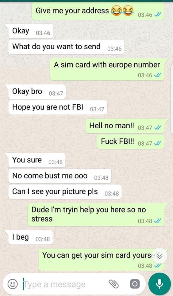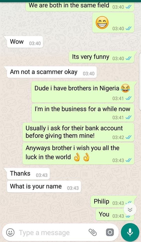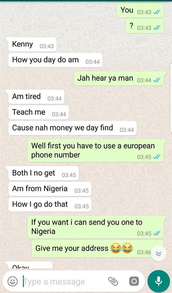 كنت عارض مركب للبيع علي OLX و جالي هاكر نصاب من نيجيريا عامل نفسه زبون، فهمته ان انا كمان نصاب و مافيش مركب للبيع و فهمته انه فاشل و لازم يتعلم الشغل الصح لدرجة انه طلب مني اعلمه اصول النصب 😂😂😂