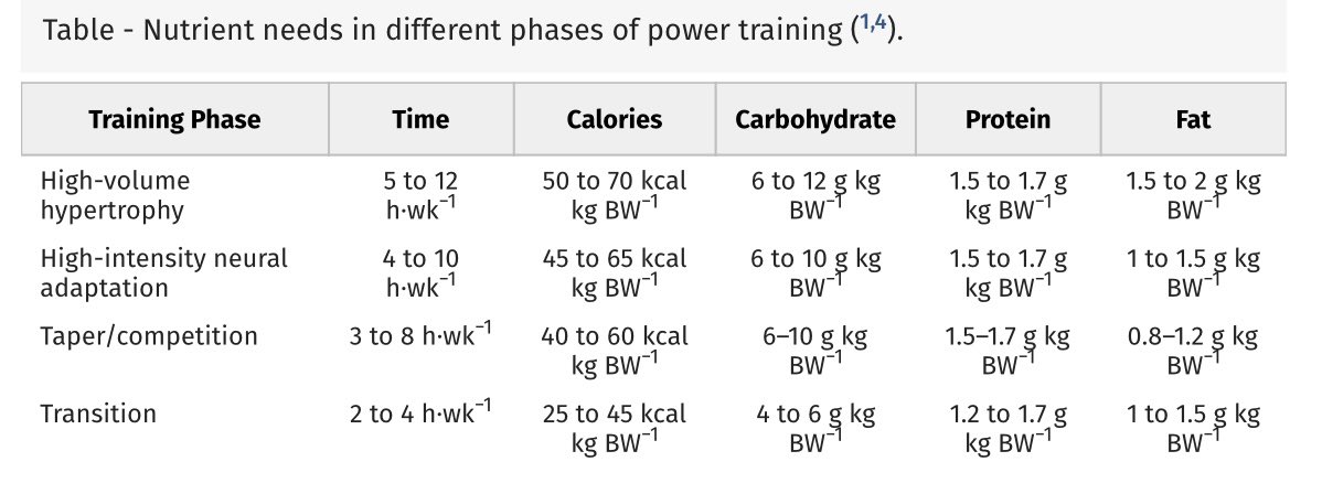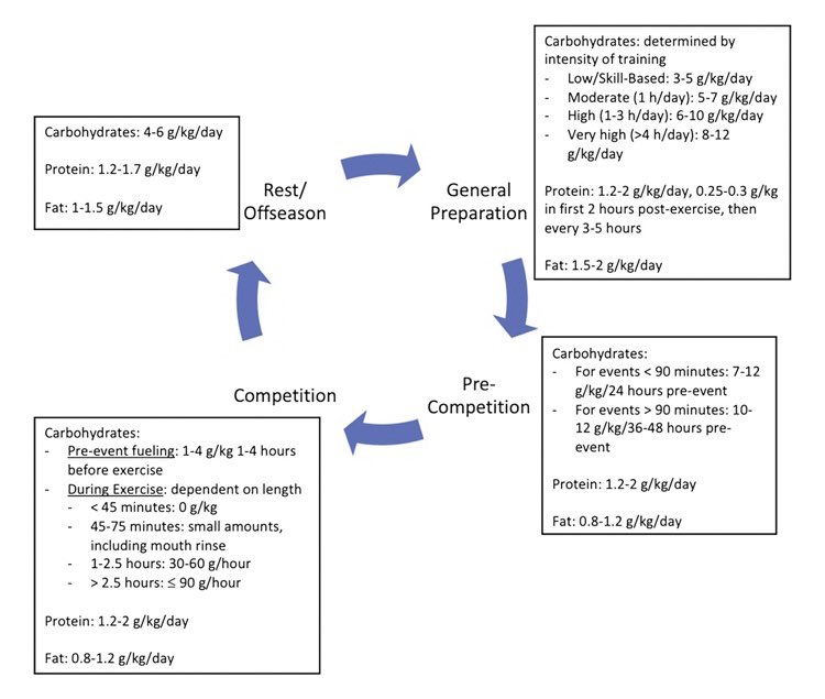 أيضا تختلف كمية السعرات الحرارية والمغذيات الكبرى بناءًا على نوع الرياضي والموسم التدريبي