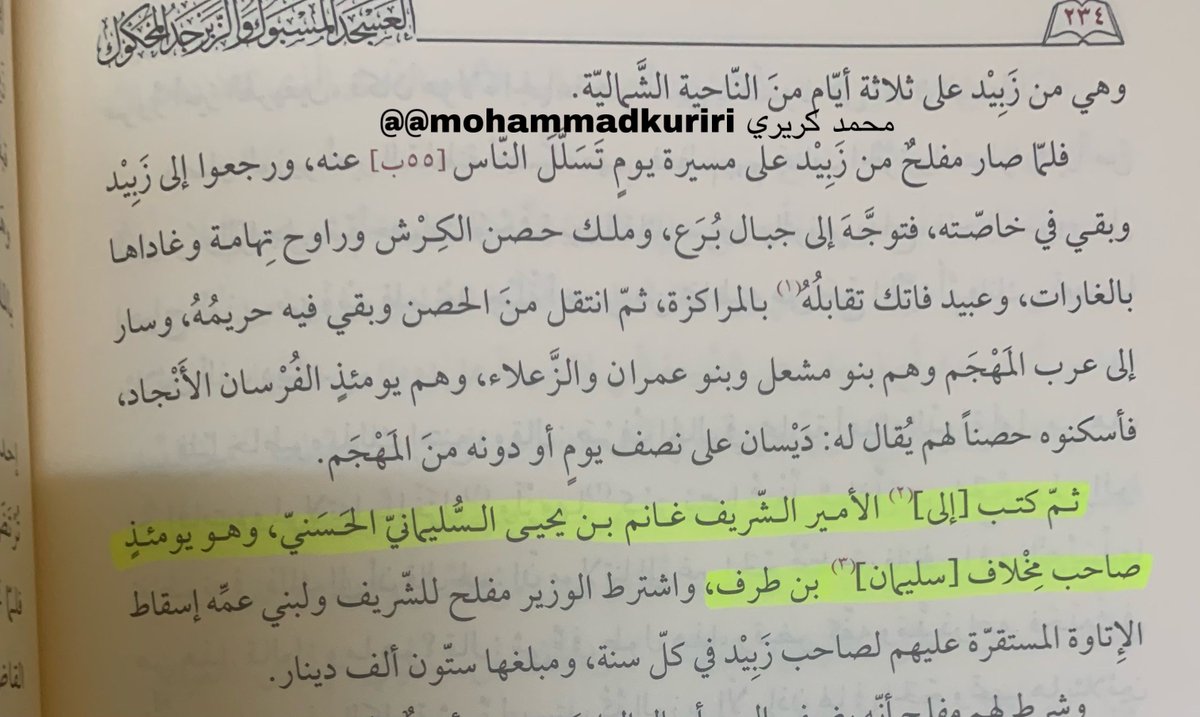 ( ثم كتب إلى الأمير غانم بن يحيى السليماني الحسني وهو يومئذ صاحبُ مخلاف سليمان بن طرف ) .