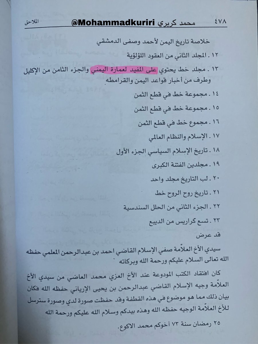 مؤرخة في سنة ١٣٧٣هـ ، وفي البيان عدة كتب ، منها مجلد مخطوط يضم كتاب ( المفيد ) لعمارة اليمني . وكان الإرياني سُجِنَ سنة ١٣٦٧هـ مع آخرين في الأحداث التي أعقبت اغتيال الإمام يحيى حميد الدين ملك اليمن .