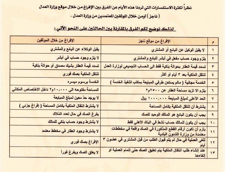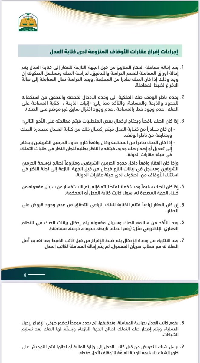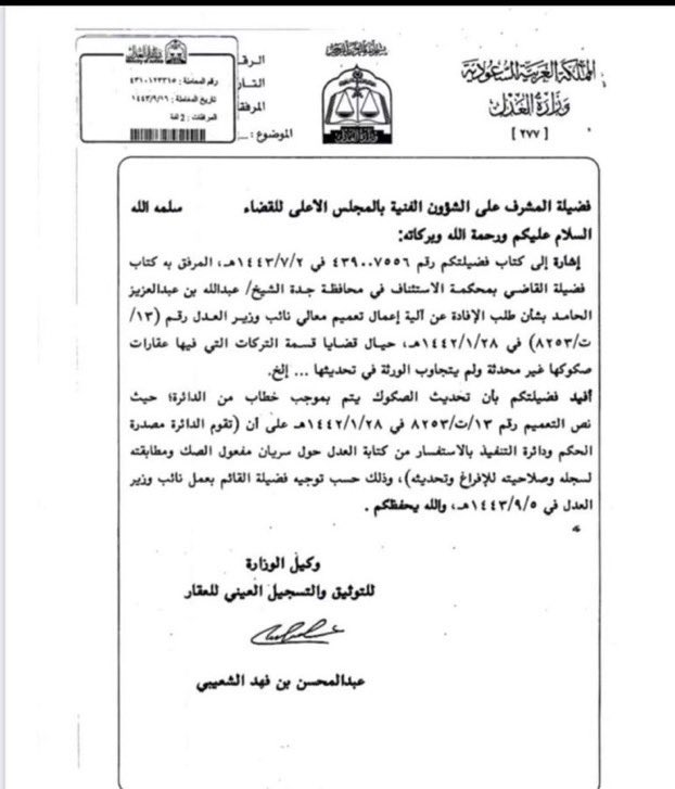 ٢٩/بموجب #التعميم_القضائي رقم (13/ت/7776) وتاريخ 08/09/1440هـ يكتفى بحضور أحد الورثة لدى كاتب العدل لتسجيل نقل ملكية صك مورثهم باسم الورثة بحسب صك حصر الورثة دون طلب وكالات من بقيتهم تيسرا لهم